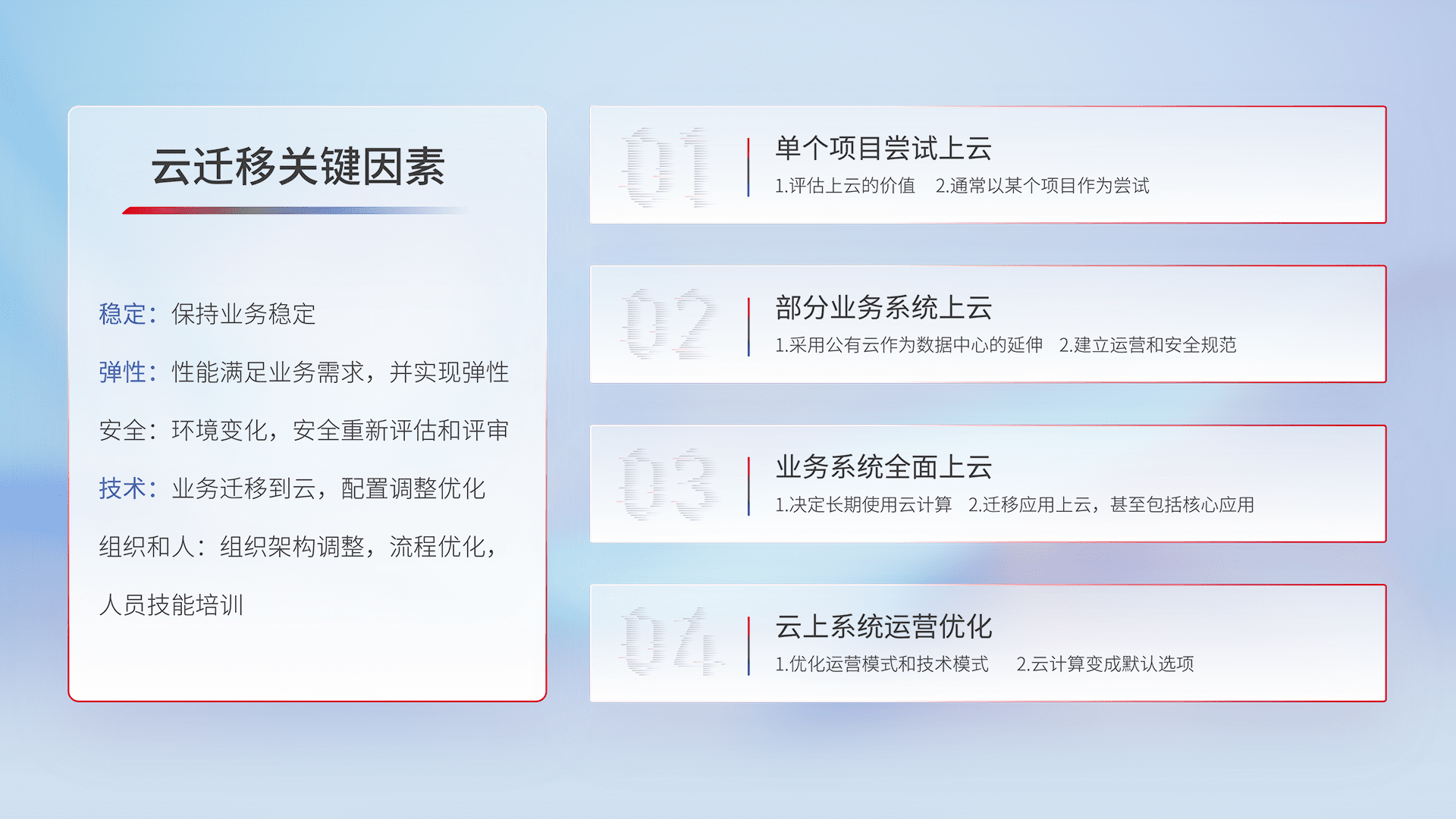 结合实际业务,,,从规划设计、、、、云平台选型、、云原生改造、、、、数据迁移、、、、集成交付,,,迁移全过程为客户识别最佳上云路径,,,做好风险识别管理,,,设计网络架构、、、身份权限、、、、安全审计合规、、、操作审计、、日志审计、、监控告警策略、、、、多站点容灾设计等,,,,对云上基础设施进行整体规划,,提升IT治理水平,,,以满足弹性、、、、高可用、、、、高性能的需求。。。。