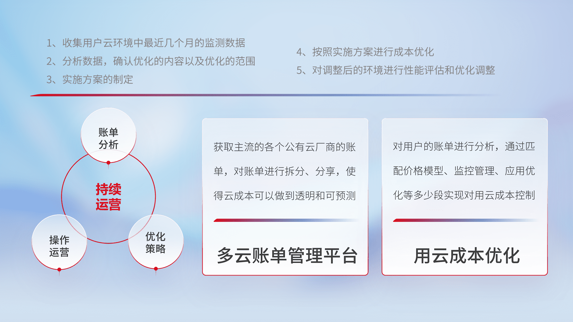通过多云纳管,,,,以统一的资源数据模型把客户的云资源进行抽象和封装,,,,进而实现对多云资源的统一操作,,,保障云资源管理的可靠性、、、稳定性与可用性。。。量身定制化运维内容,,,,配置、、开发运维、、补丁管理、、、、备份、、、、监控、、认证和访问管理、、、审计和日常巡检等,,,,保障在用云过程中的可靠度,,稳定度以及高可用率。。